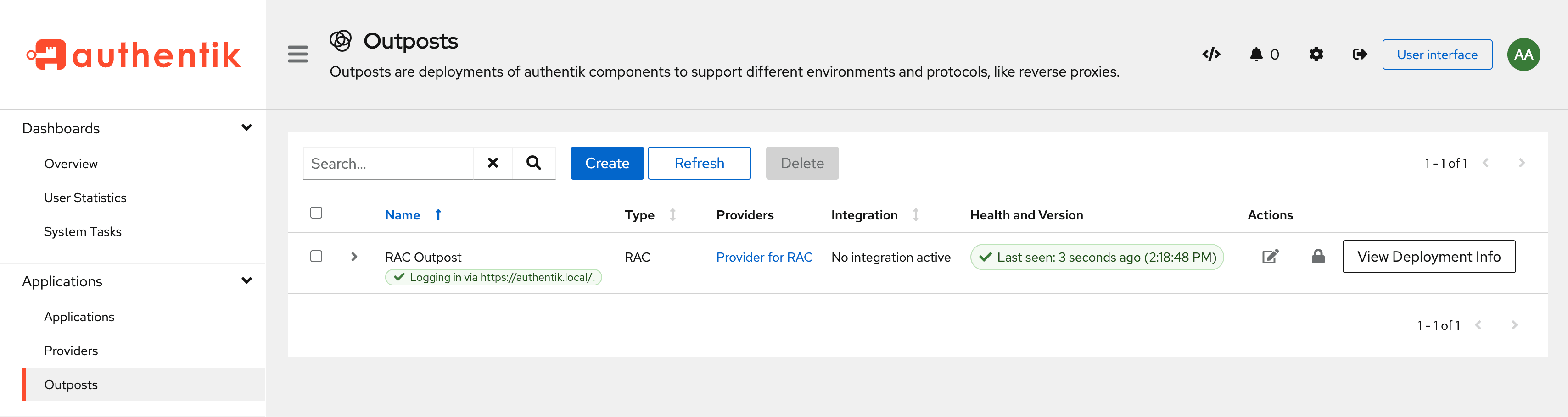 To check if any outposts are out-of-date, navigate to Applications > Outposts and look for a message in the Health and Version column.