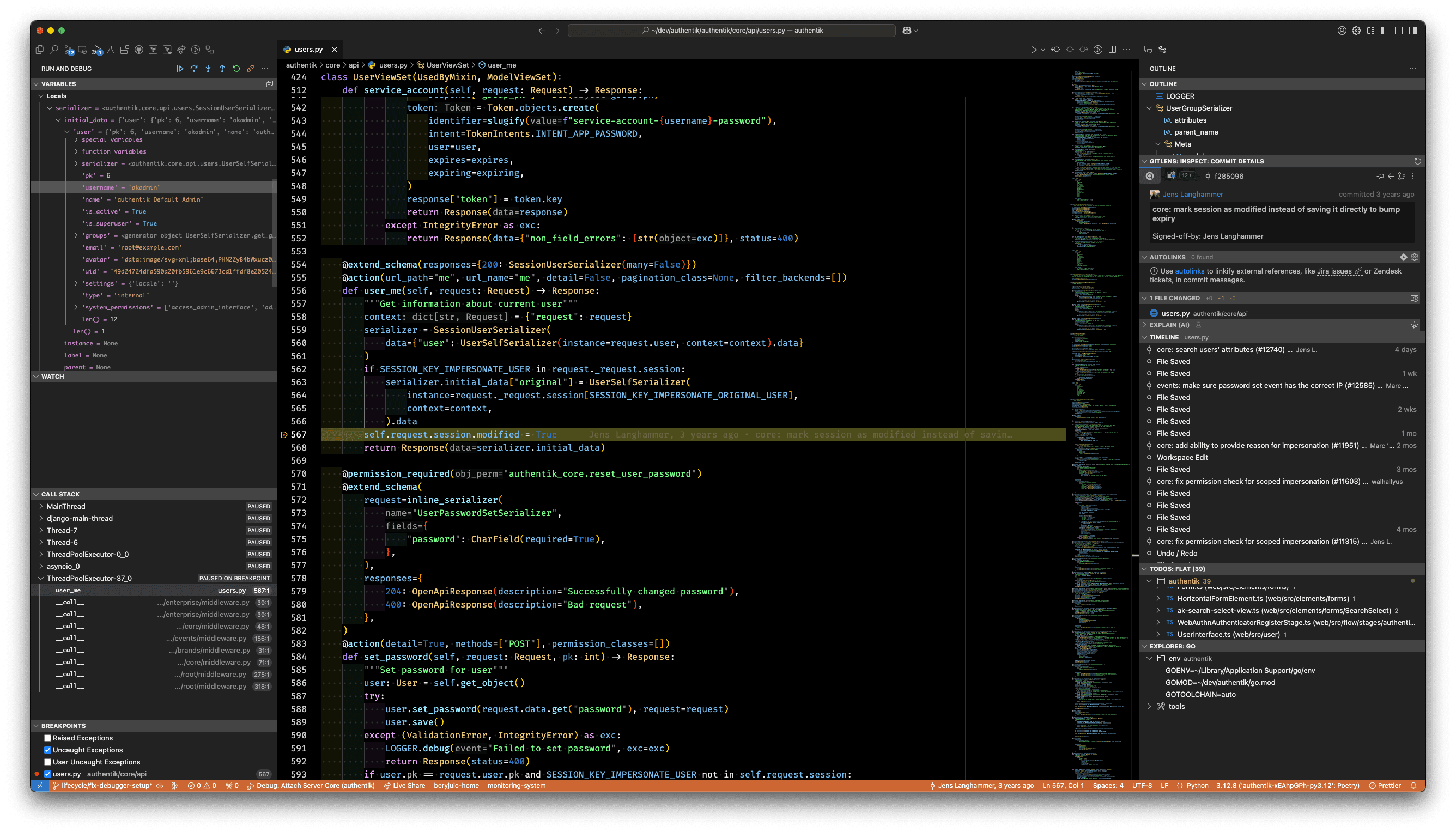 The majority of the authentik codebase is in Python, running in Gunicorn for the server and Dramatiq for the worker. These instructions show how this code can be debugged/inspected. The local debugging setup requires a setup as described in Full development environment